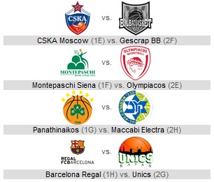 De asemenea, Montepaschi Siena și Olympiakos Pireu se reîntâlnesc în sferturile de finală. Anul trecut elenii aveau prima șansă și au dispus de avantajul terenului propriu, însă acest lucru nu a împiedicat echipa campioană a Italiei să revină după un prim joc mizerabil pentru a se impune cu scorul general de 3-1. De această dată Siena se bucură de statutul de favorită și dispune de avantajul terenului propriu.