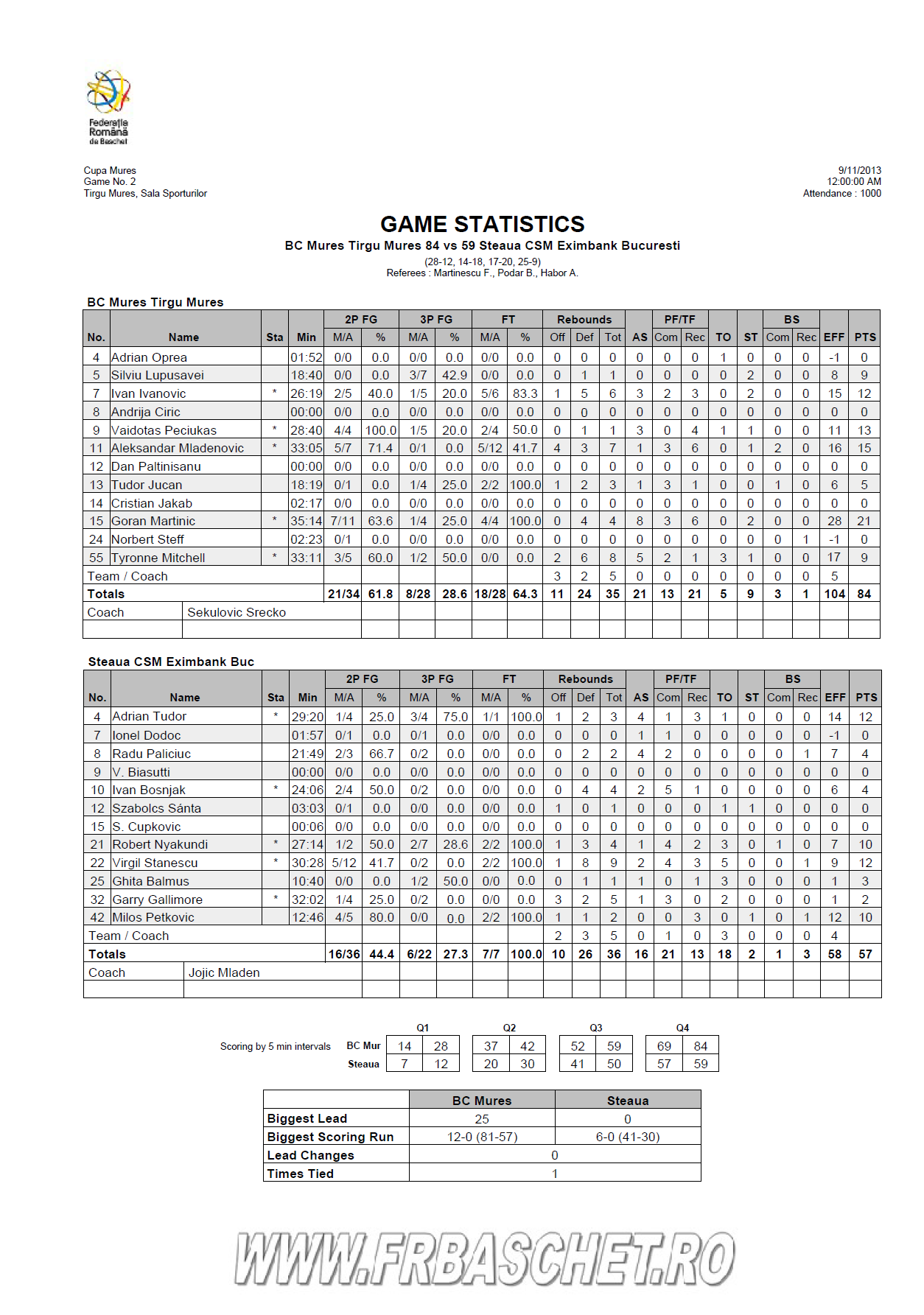 Cupa Mureș - statistica meciului BC Mureș - Steaua CSM București, scor 84-59