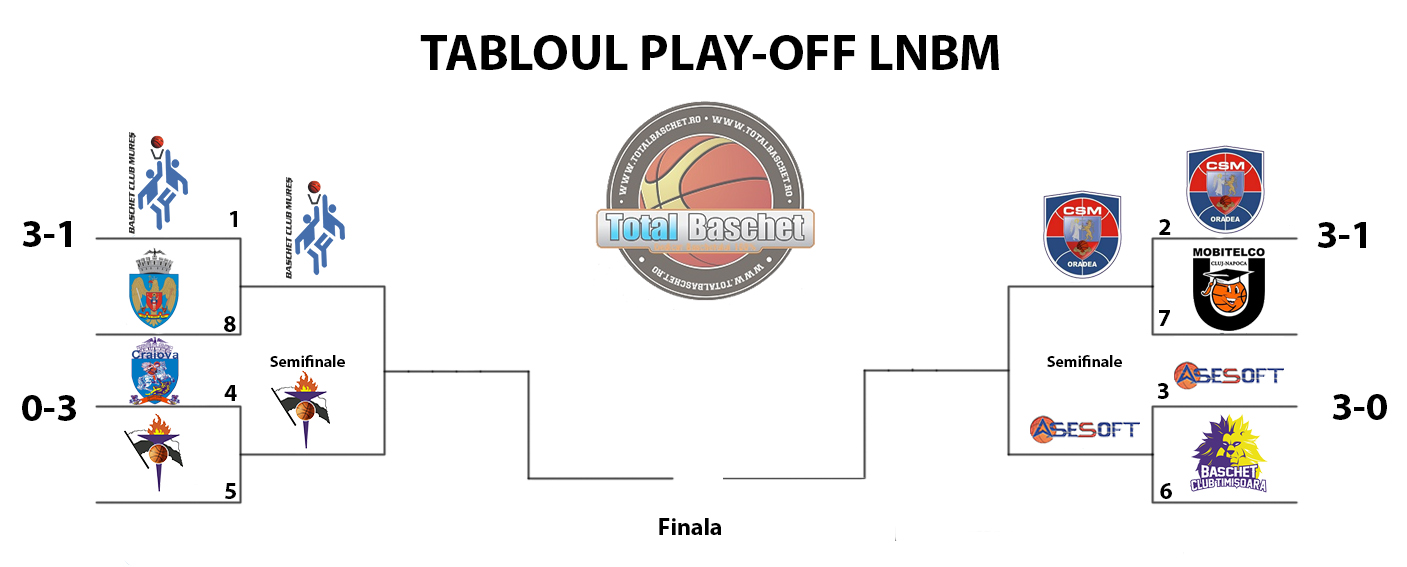 Careul de ași ai Ligii Naționale este complet. În urma jocurilor desfășurate duminică (21.04), BC Mureș și CSM Oradea, adică locurile 1 și 2 la încheierea sezonului regulat, și-au asigurat locul în penultimul act al competiției.