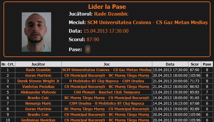 - Branko Cuic - 19 pase decisive, 4.8 în medie pe meci la seria BC Mureș vs CSM București, scor 3-1