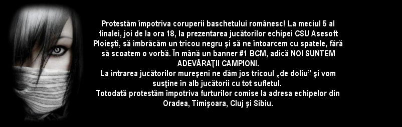 cu 12 ani în urmă (27.05.2013) RaspundeRespect..... dar oare aceste minti asa zis incoronate ale baschetului romanesc vor pricepe mesajul? Eu cred caal lor neuron stingher o sa ramana in stinghereala lui si tot efortul o sa fie in van! Pana nu pleaca acest berceanu baschetul nu o sa mai fie baschet.... Madam Tocmeala prezenta parca mai mult bun simt si parca era mai discreta in actiuni! In nici un an nu au fost albitraje mai jenate, mai jegoase si mai cretine ca anul acesta! maracinele de matraguna a facut absolut ce a vrut, cand a vrut si cum a vrut fara nici un dram de bun simt! Eu as propune un protest mai"violent", sali goale cu scaune imbracate in negru..... Un sport fara suporteri nu este sport! Daca cu vorba buna nu vor ar trebui aplicat biciul!!!!!Eu as fi dispus sa imi cumpar bilet dar prezent sa fie doar un tricou negru! Numai "U"
